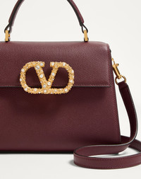 Valentino Garavani VSLING small handbag in grainy calfskin leather with VLogo Signature jewel closure. The bag can be worn on the shoulder/crossbody by using the extendable shoulder strap, or handheld thanks to the handle. - Antique brass-finish hardware - Magnetic closure embellished with synthetic pearls and Swarovski® crystals - Leather shoulder strap with adjustable chain detail - Protective feet - Nappa leather lining. Interior: one zipper pocket Shoulder strap drop length: min. 45 cm to max. 59 cm / min. 17.7 in. to max. 23.2 in. - Dimensions: W22xH17xD9 cm / W8.7xH6.7xD3.5 in. - Made in Italy This product contains magnets. Please consider if this product will be worn within 15 cm from any implanted device. Any concerns please contact your healthcare professional. Product code: 7W2B0F53XPW_DYE