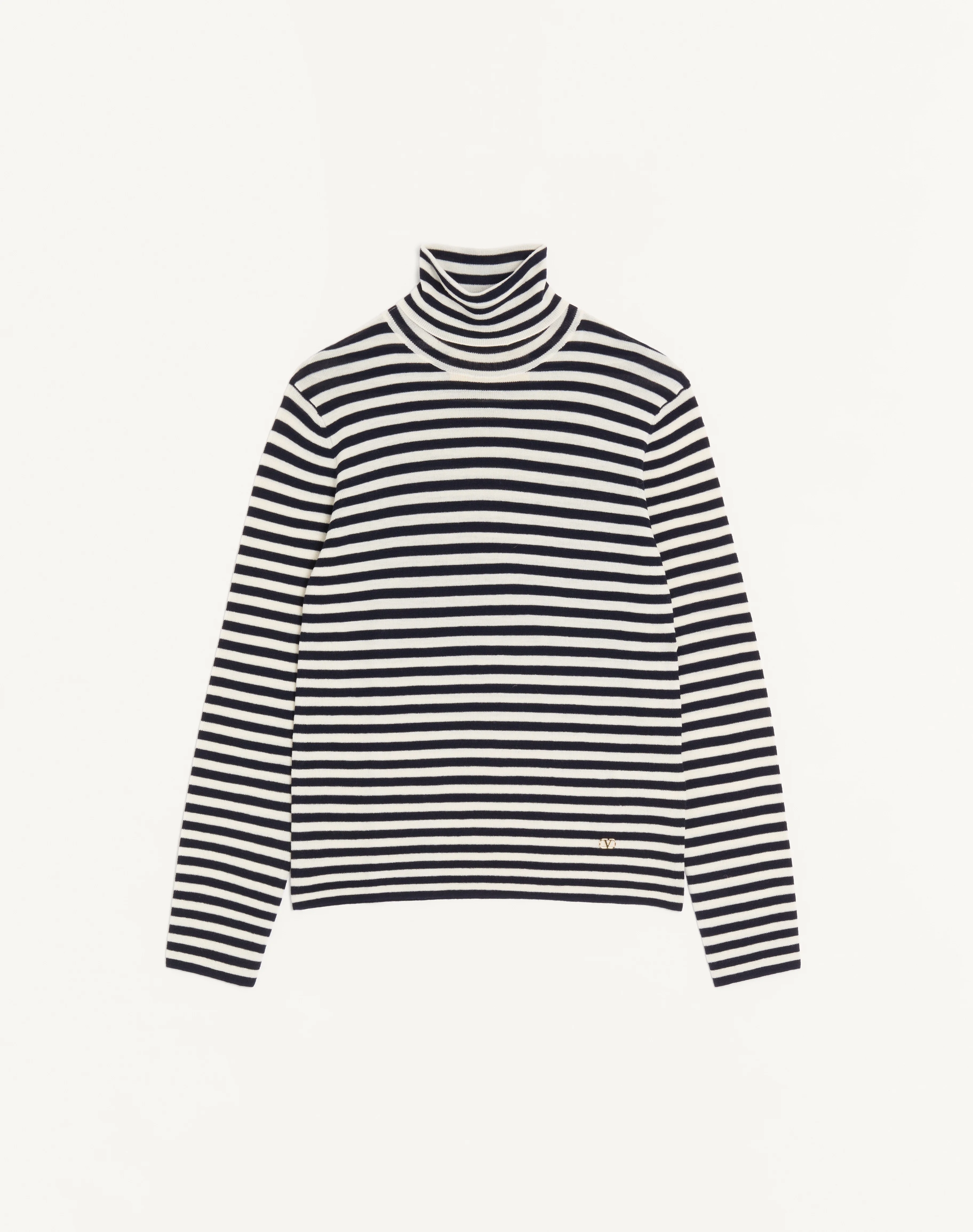 Valentino high-neck wool sweater with VLogo patch - Slim fit - Gauge: 14 - VLogo patch on the bottom - Composition: 100% Wool - Length: 66 cm / 25.9 in. from the back of the neck in an Italian size M - The model is 187 cm / 6'1" tall and wears an Italian size M - Made in Italy The look of the model is completed by a Valentino Garavani Hoboho Bag and Valentino Garavani Mockers Shoes. Product code: 8V3KC36IBAE_6A1