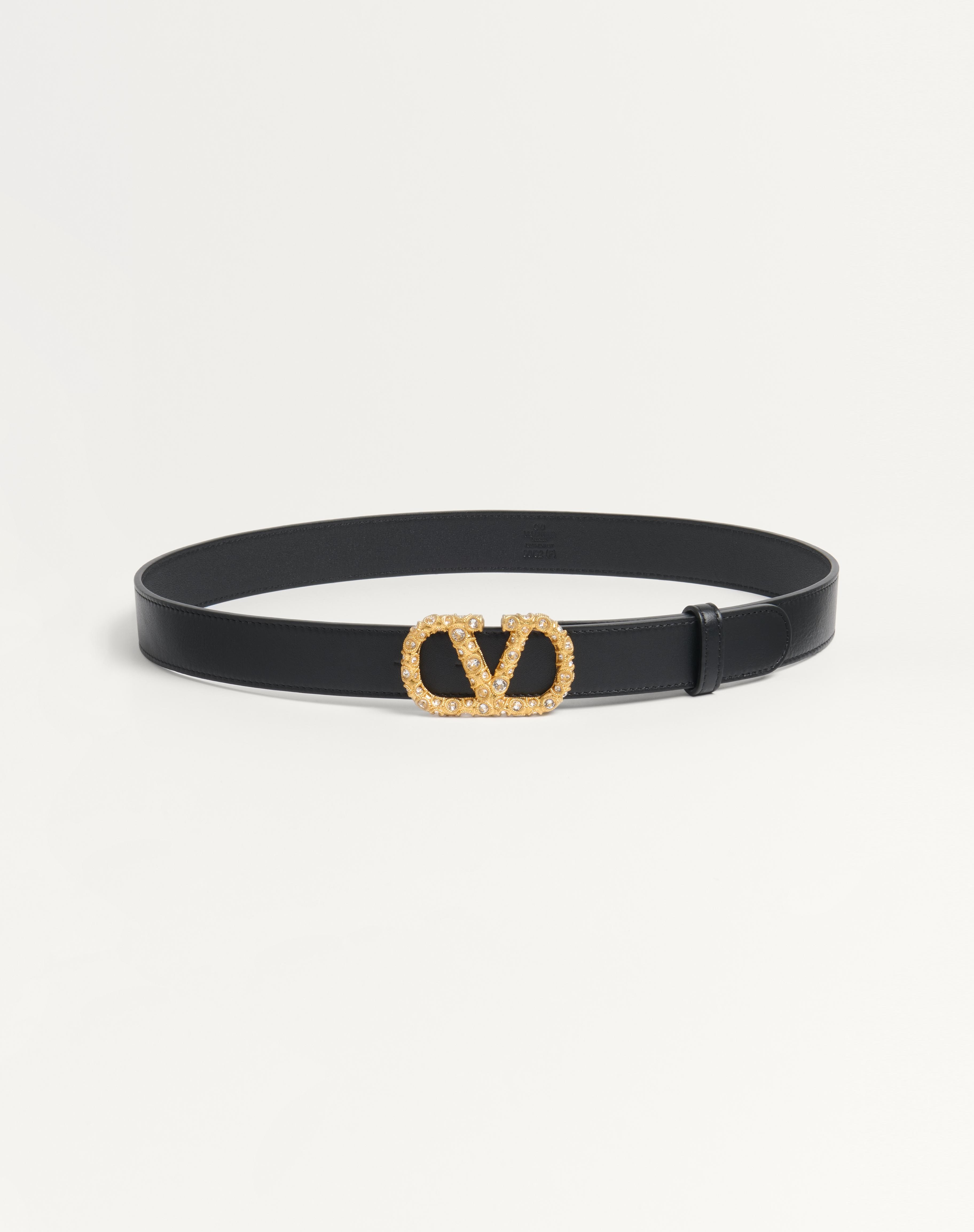 Valentino Garavani VLogo Signature belt in shiny calfskin with crystals. - Vlogo Signature buckle in antique brass finish with Swarovski® crystals - Shiny calfskin exterior - Calfskin interior - Dimensions: H.30 mm / 1.18 in. - Made in Italy Product code: 6W2T0SM9GBI_EDM