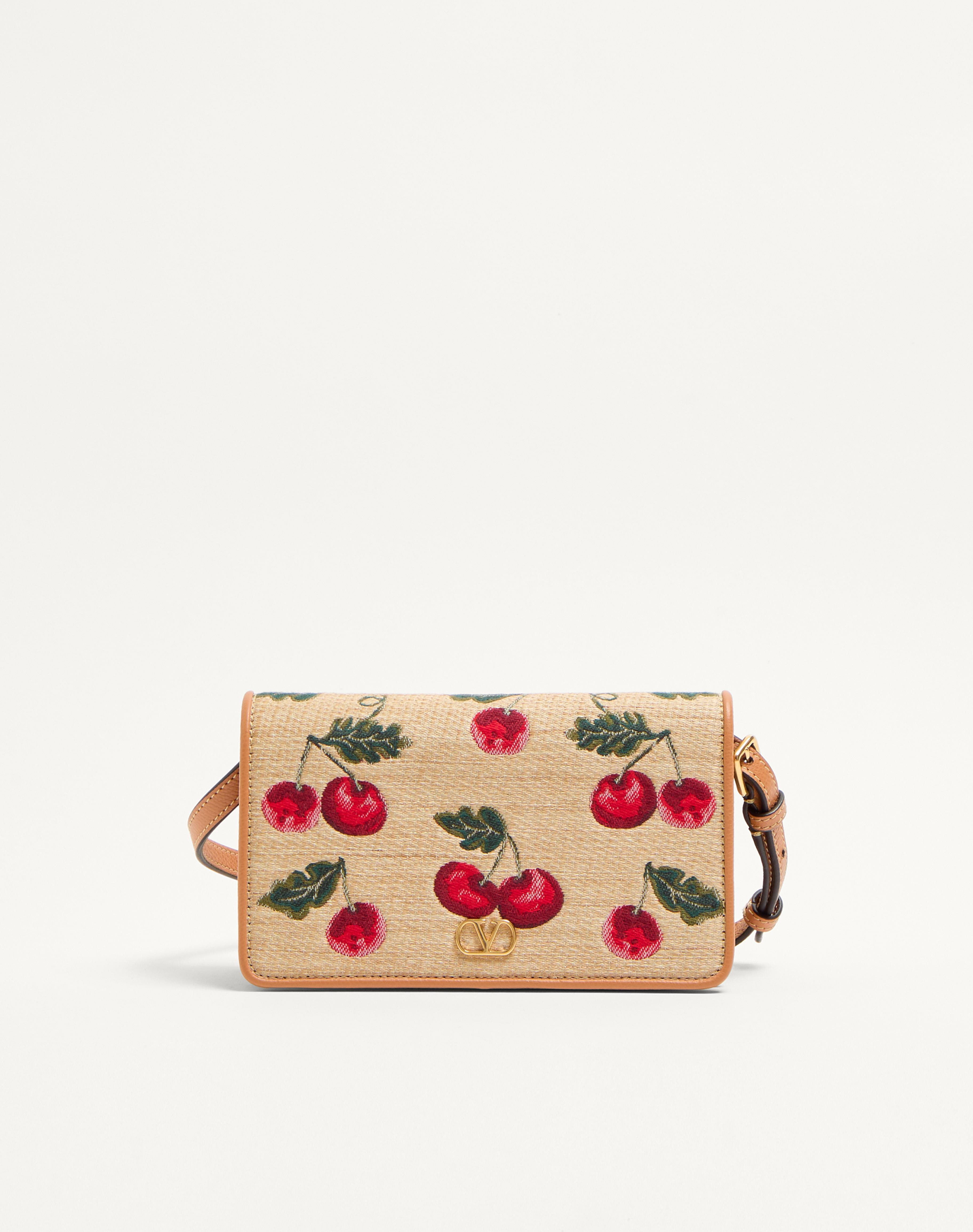 Valentino Garavani Vlogo Signature mini shoulder bag in Jacquard Synthetic Raffia with cherry pattern. The bag can be comfortably worn on the shoulder thanks to the adjustable leather handle. - Magnetic button closure - Logo and hardware in antique brass finish - Nappa lining. Interior: one zipped pocket and three card slots - Removable and adjustable leather shoulder strap. Drop length: 21.5 cm / 8.5 in. - Dimensions: W20xH12xD5 cm / W7.8xH4.7xD1.9 in. - Made in Italy This product contains magnets. Please consider if this product will be worn within 15 cm from any implanted device. Any concerns please contact your healthcare professional. Product code: 6W0P0AK8CJR_R9F