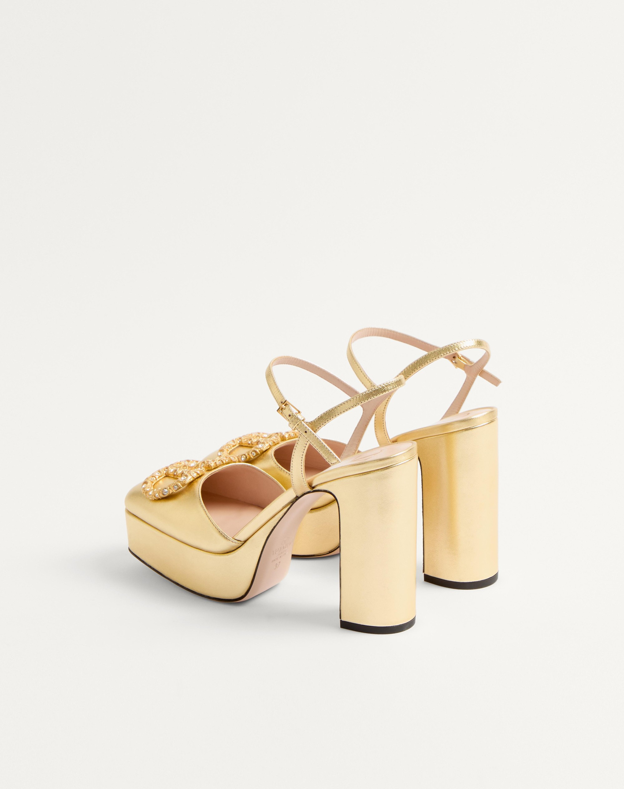 Valentino Garavani platform pump in laminated nappa with VLogo Signature decoration - VLogo Signature accessory in vintage brass finish with crystal applique - Heel height: 115 mm / 4.5 in. with 35 mm / 1.4 in. platform - Made in Italy Product code: 6W2S0LF8LUY_9MR