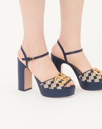 Valentino Garavani platform sandal in crochet fabric, kidskin leather details and VLogo Signature decoration - VLogo Signature accessory with antique-effect brass finish - Block heel and platform wrapped in kidskin leather - Heel height: 115 mm /4.5 in. with 35 mm /0.8 in. platform - Made in Italy Product code: 8W0S0FG2JZU_3NL