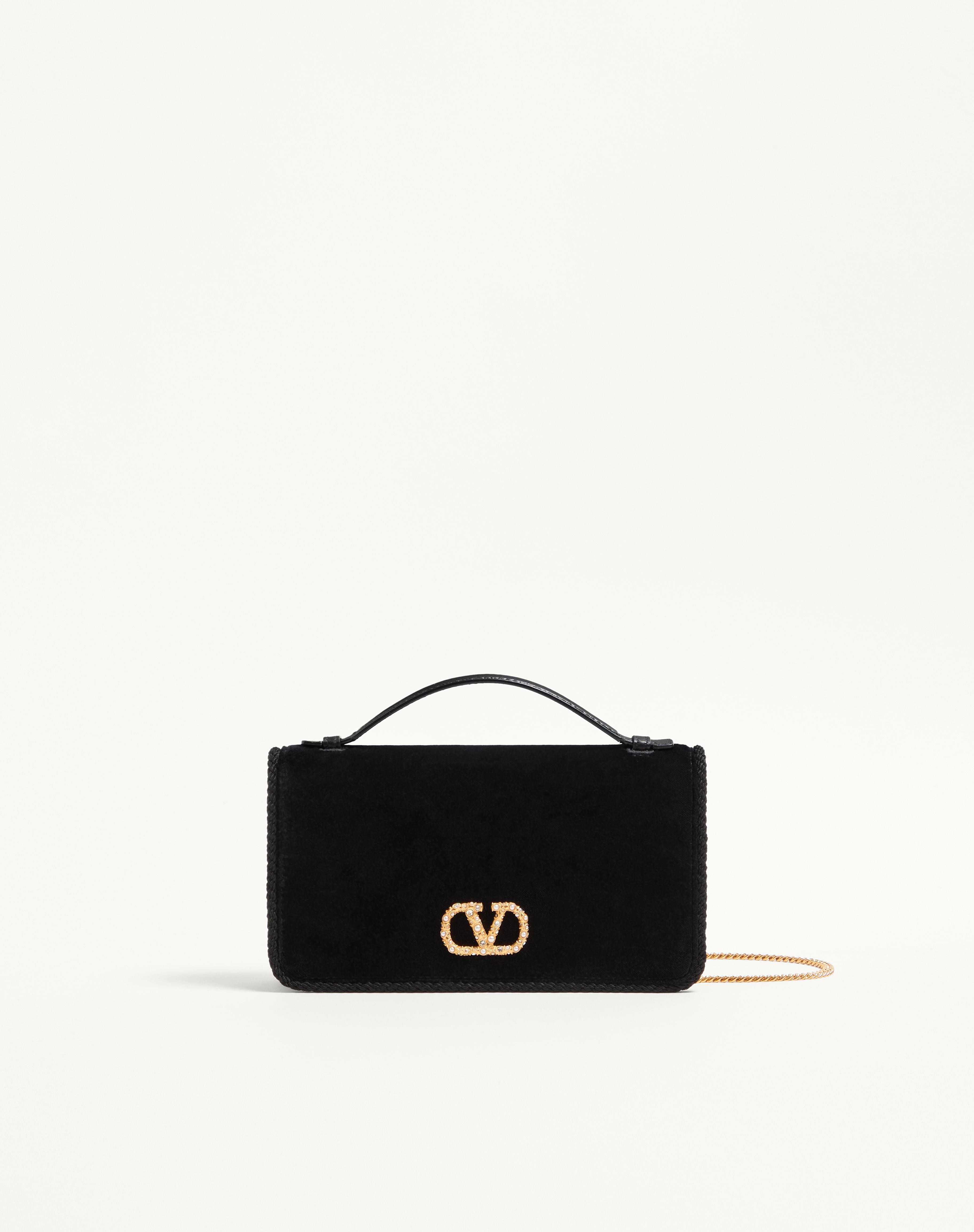 Valentino Garavani VLogo Signature velvet chain wallet with jewel logo. The accessory can be handheld or may be worn crossbody or over the shoulder thanks to the handle and the detachable chain. - Antique brass finish logo and hardware - Jewel logo adorned with synthetic pearls and Swarovski® crystals - Magnetic button closure - Leather handle - Moire lining. Interior: zippered wall pocket and two card slots - Removable chain. Shoulder strap drop length: 55 cm / 21.7 in. - Dimensions: W19xH11xD4 cm / W7.5xH4.3xD1.6 in. - Made in Italy Product code: 7W2P0AU1CPX_BBK