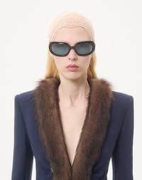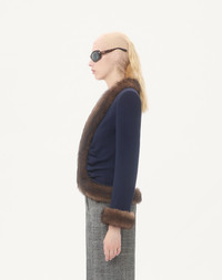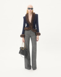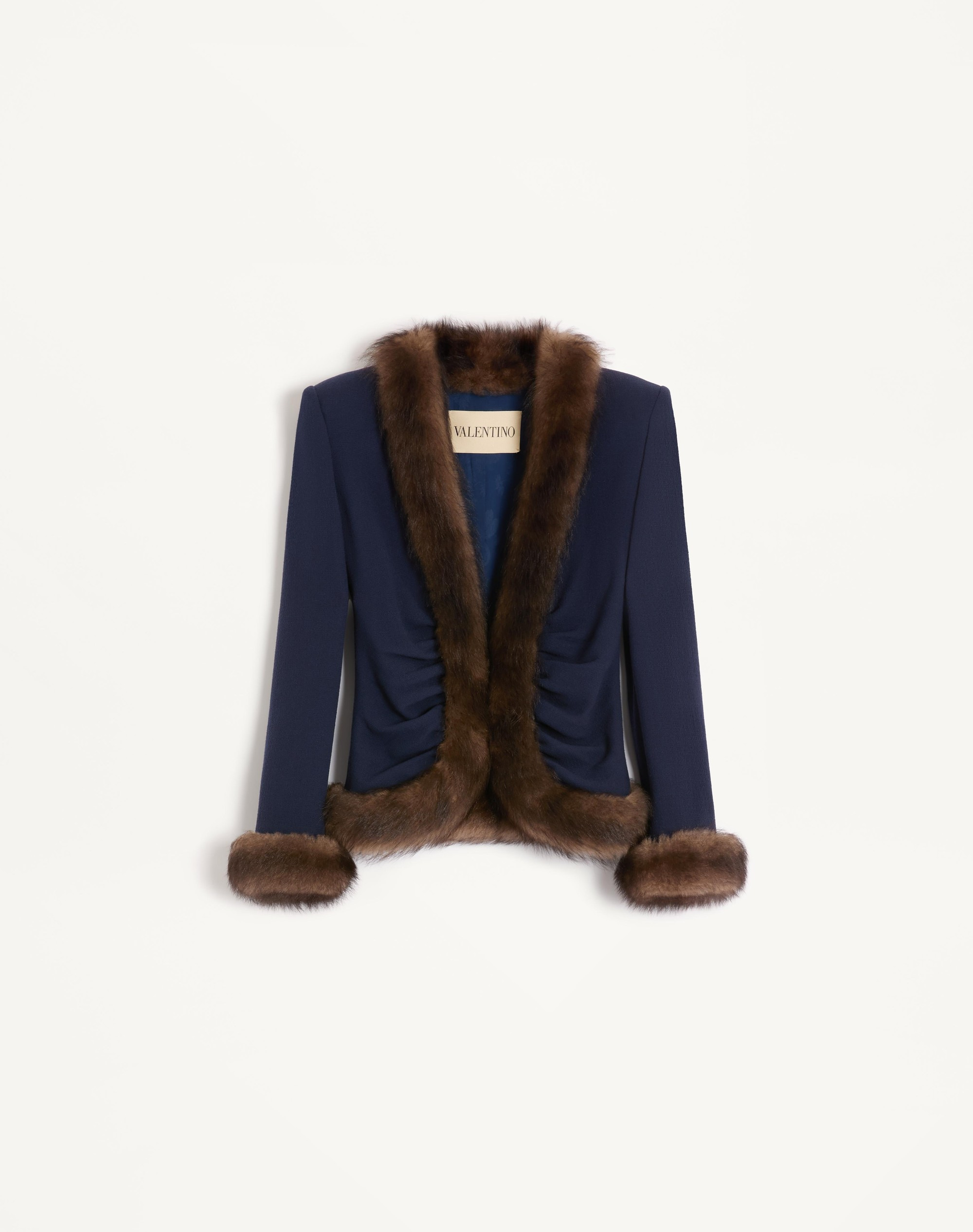 Wool Crepe Jacket with Shearling Trim - Shoulder pads - Hook-and-eye front closure - Wool Crepe (100% Virgin Wool) - VLogo Flower Jacquard Lining (75% Acetate, 25% Silk) - Length: 54 cm / 21.3 in. from the shoulders in an Italian size 40 - The model is 176 cm / 5'9" tall and wears an Italian size 40 - Made in Italy The look of the model is completed by a Valentino Garavani Panthea Bag and Valentino Garavani Panthea Shoes. Product code: 7B0CE4U59Q0_D51