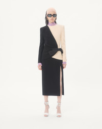 Wool Crepe midi dress with contrasting bodice and Faille bow - Padded shoulder straps - Heart jewel button on cuffs - Rear zipper and hook-and-eye closure - Wool Crepe (100% Virgin Wool) - Habotai lining (100% Silk) - Length: 125 cm / 49.2 in. from the shoulders in an Italian size 40 - The model is 176 cm / 5'9" tall and wears an Italian size 40 - Made in Italy The look of the model is completed by Valentino Garavani Drip Rose Shoes. Product code: 7B0VAGG69Q0_TB1