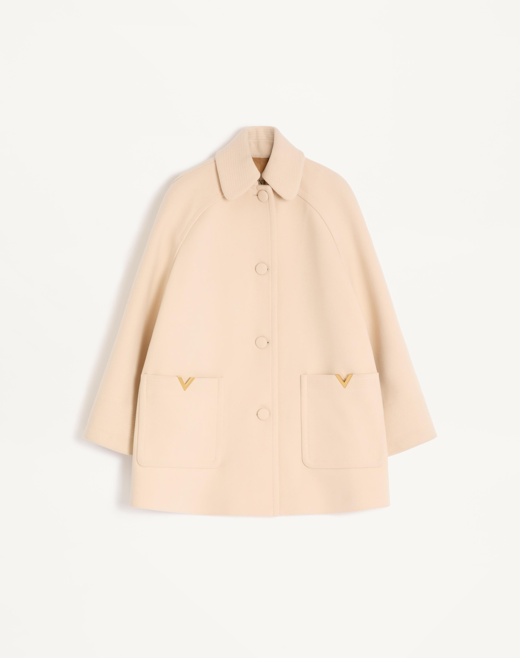 Wool Drap Peacoat with collar - V Gold detail on pockets - Relaxed fit - Front button closure - Wool Drap peacoat (100% Virgin Wool) - Flower, Stripes and VLogo Lining (74% Acetate, 26% Silk) - Length: 85 cm / 33.5 in. from the shoulders in an Italian size 40 - The model is 176 cm / 5'9" tall and wears an Italian size 40 - Made in Italy The look of the model is completed by a Valentino Garavani Hoboho Bag and Valentino Garavani Shoes. Product code: 7B0CA3Z79UK_ET5
