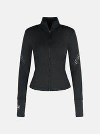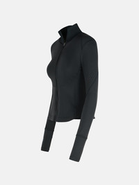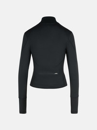 Manufacture code: JW4551 BLACK Retail code: JW4551 BLACK Ribbed raised collar, zip closure, exposed stitching, breathable puncture on the sleeves, back zip pocket, thumb hole cuffs Main: 73% nylon, 27% elastane Made in China