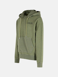 Manufacture code: AMJYHD1121 OLIVE Retail code: AMJYHD1121 OLIVE Large drawstring hood, front pouch pocket, mild contrast 'Amiri' print, ribbed hem and cuffs, oversized fit Main: 100% cotton Made in Italy