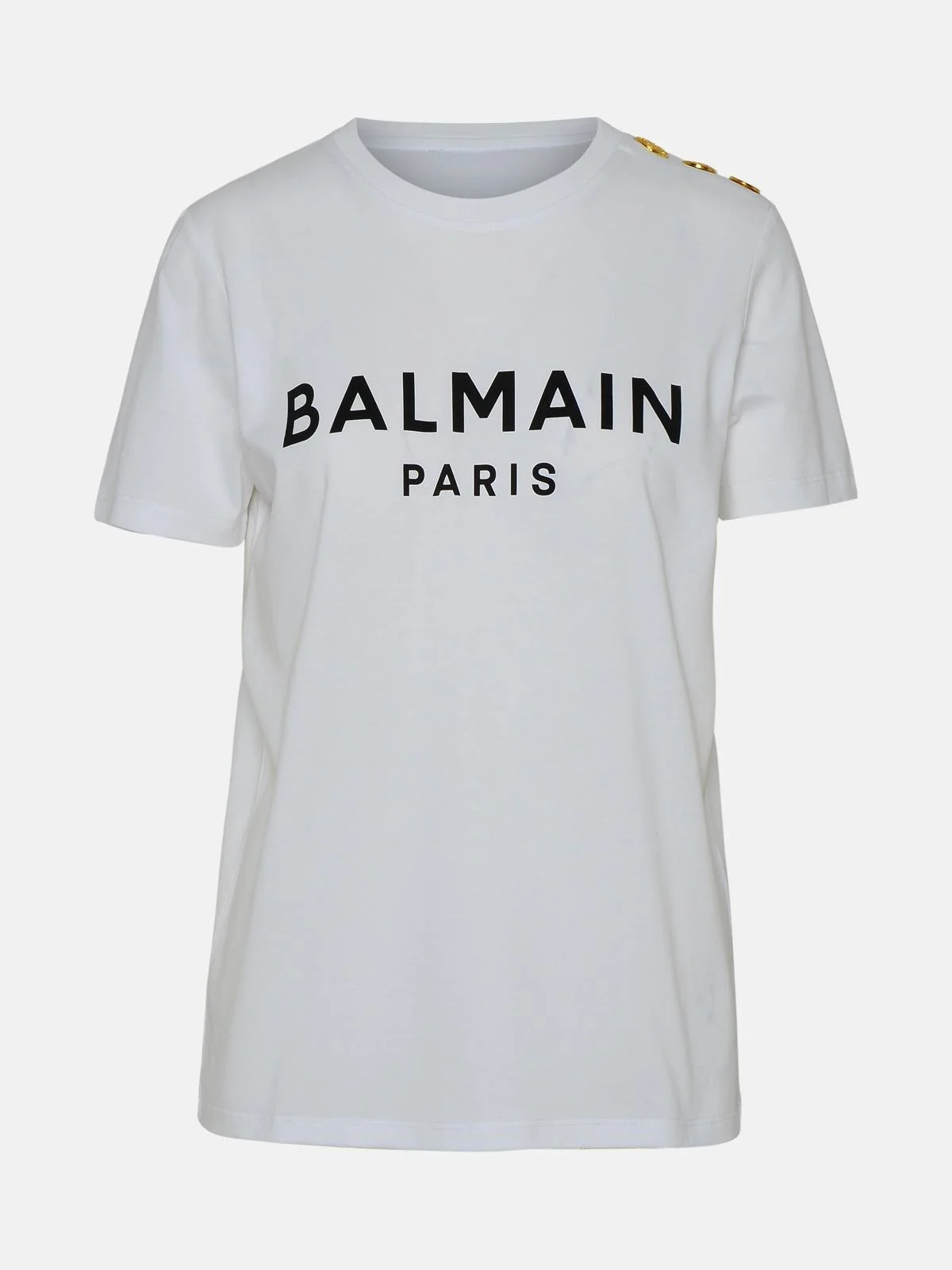 Manufacture code: BF1EF005BB02 GAB Retail code: BF1EF005BB02 GAB Micro-ribbed round collar, three logo engraved buttons on the shoulders, and BALMAIN PARIS logo printed on the front Material: 100% cotton Made in Portugal
