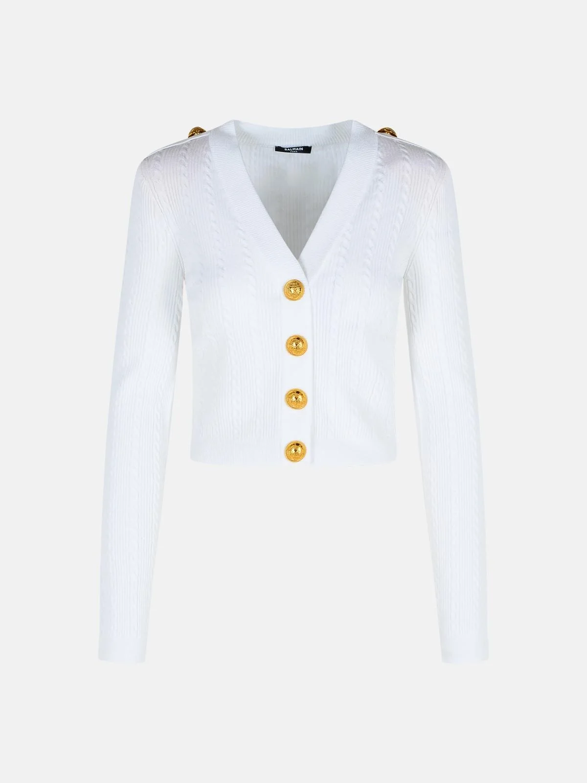 Manufacture code: FF1KL245KI50 0FA Retail code: FF1KL245KI50 0FA Ribbed 'V' neckline, front button closure, decorative braided pattern, ribbed hem and polls Main: 83% viscose, 17% polyester Made in France
