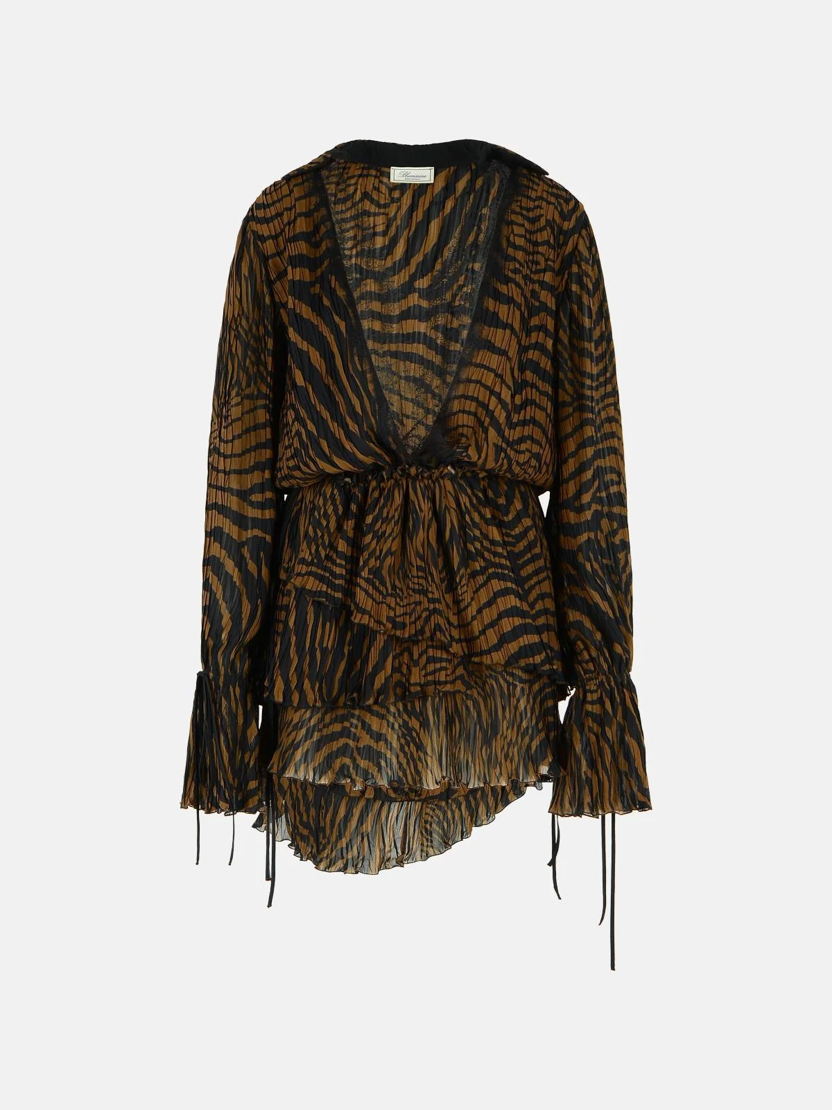 Manufacture code: 2A802A M5179 Retail code: 2A802A M5179 Made of viscose chiffon, contrasting two-tone pattern, top lace edging, pointed collar, V-neck, elastic hem and cuffs with decorative laces, multi-layer skirt Main: 100% viscose Made in Italy
