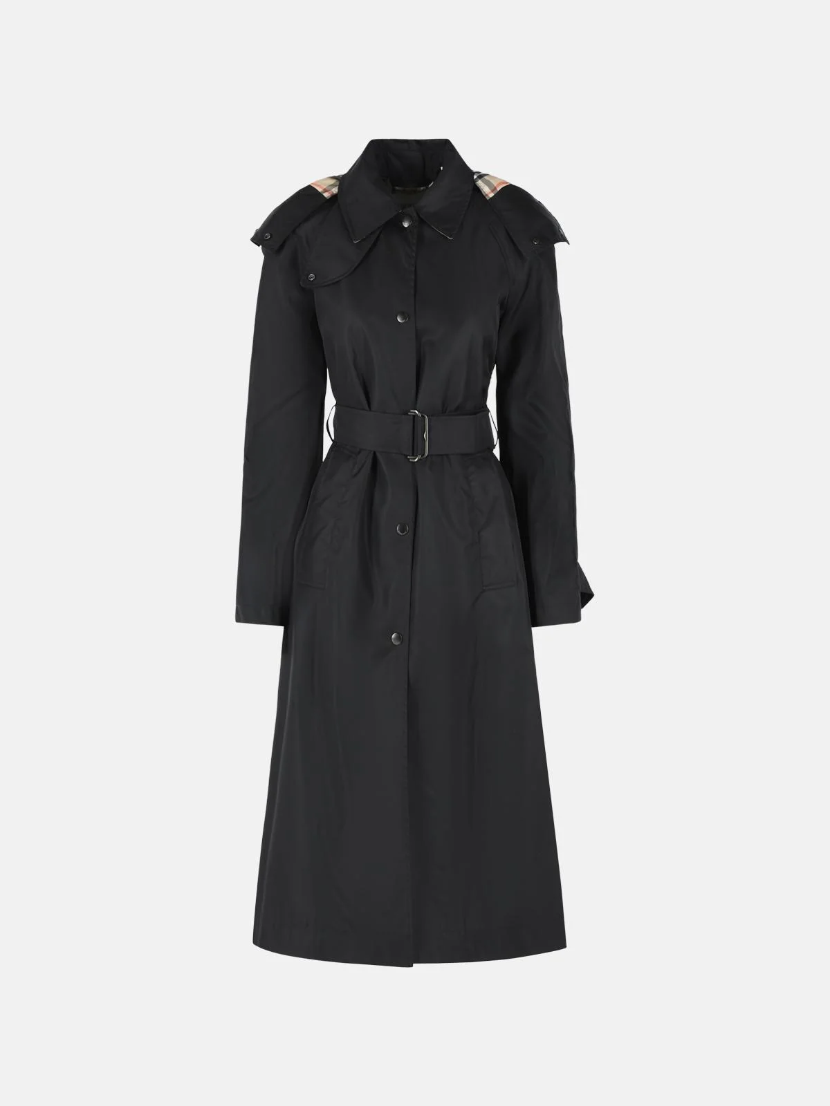 Manufacture code: 8118730 A1189 Retail code: 8118730 A1189 Single-breasted snap button closure, detachable hood with drawstring, chin strap, metal B-buckle belt, side welt pockets, cuffs with snap buttons and tabs, back vent with snap buttons, 'Burberry Check' hood and undercollar, slim fit Main: 100% nylon Made in Albania
