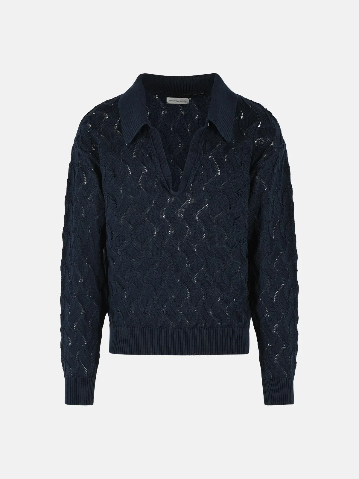Manufacture code: 021244-3718 509 Retail code: 021244-3718 509 Wide collar, front opening, knitted with abstract pattern, ribbed hem and cuffs Main: 100% cotton Made in Belgium