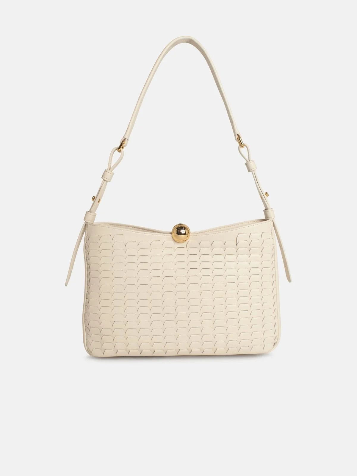 Manufacture code: WB01403 BX3977 PNN00 Retail code: WB01403 BX3977 PNN00 Adjustable shoulder strap, embossed front pattern, top closure with magnetic 'Sfera' button, inner pouch pocket, inner zip pocket, metal feet on the bottom \ 30 x 20 x 6.5 cm Main: 100% calf leather Made in China