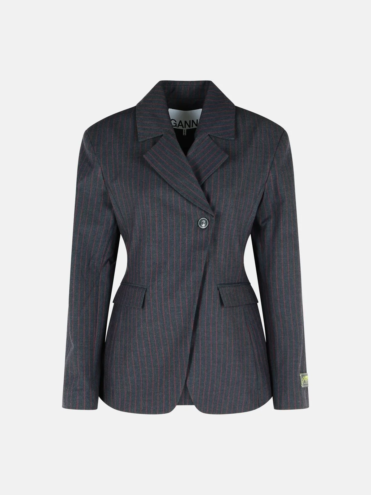 Manufacture code: W0578 252 Retail code: W0578 252 Regular fit, lapel collar, single-breasted button closure, front flap welt pockets, vertical red stripe pattern, button cuffs, 'Ganni' logo patch on the sleeve, acetate blend lining Main: 62% polyester, 32% viscose, 6% elastane Made in Turkey