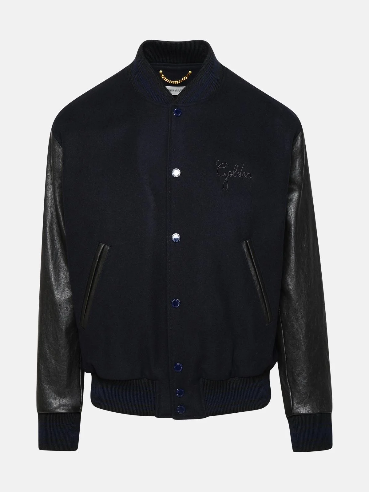 Manufacture code: GMP00834.P000617 50654 Retail code: GMP00834.P000617 50654 Jacket made of virgin wool and sheep leather blend, ribbed knit collar, front closure with logo snap buttons, tonal 'Golden' logo embroidery on the chest, front pockets with leather insert, black leather sleeves with distressed treatment, double gold star on the back, ribbed trims Main: 72% virgin wool, 28% nylon Made in Italy