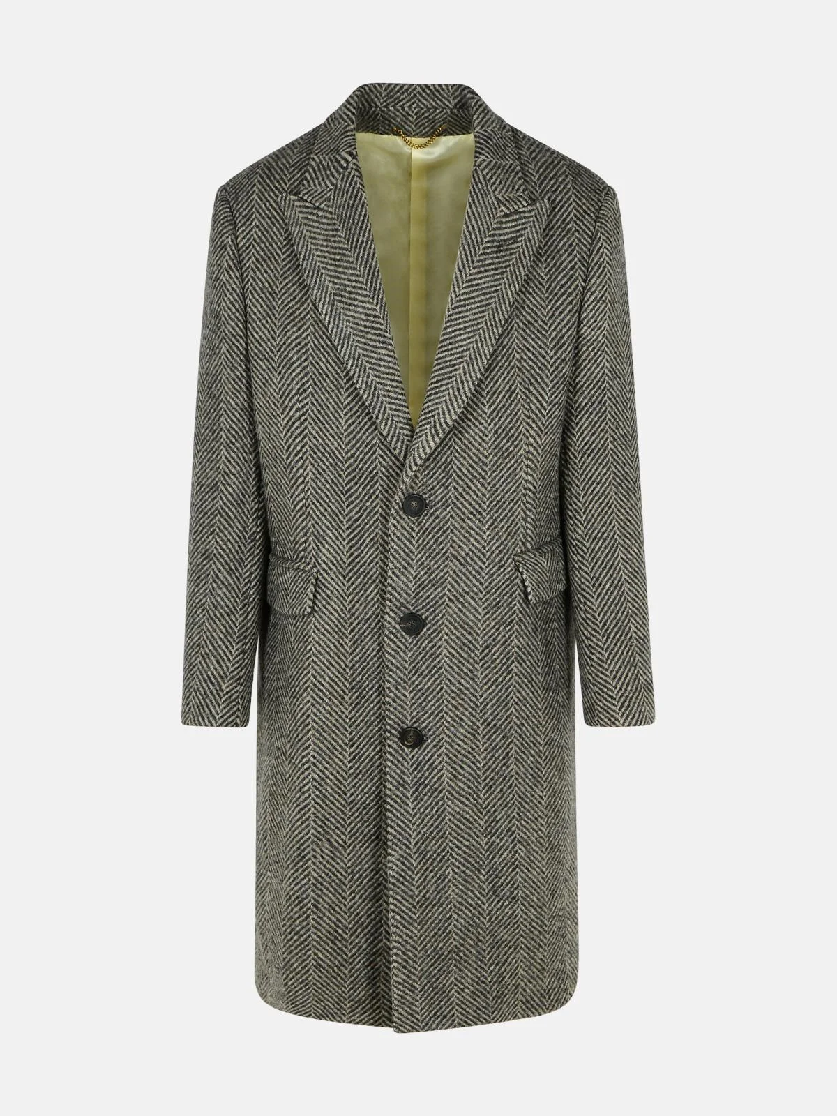 Men's single-breasted wool coat with beige and gray herringbone weave