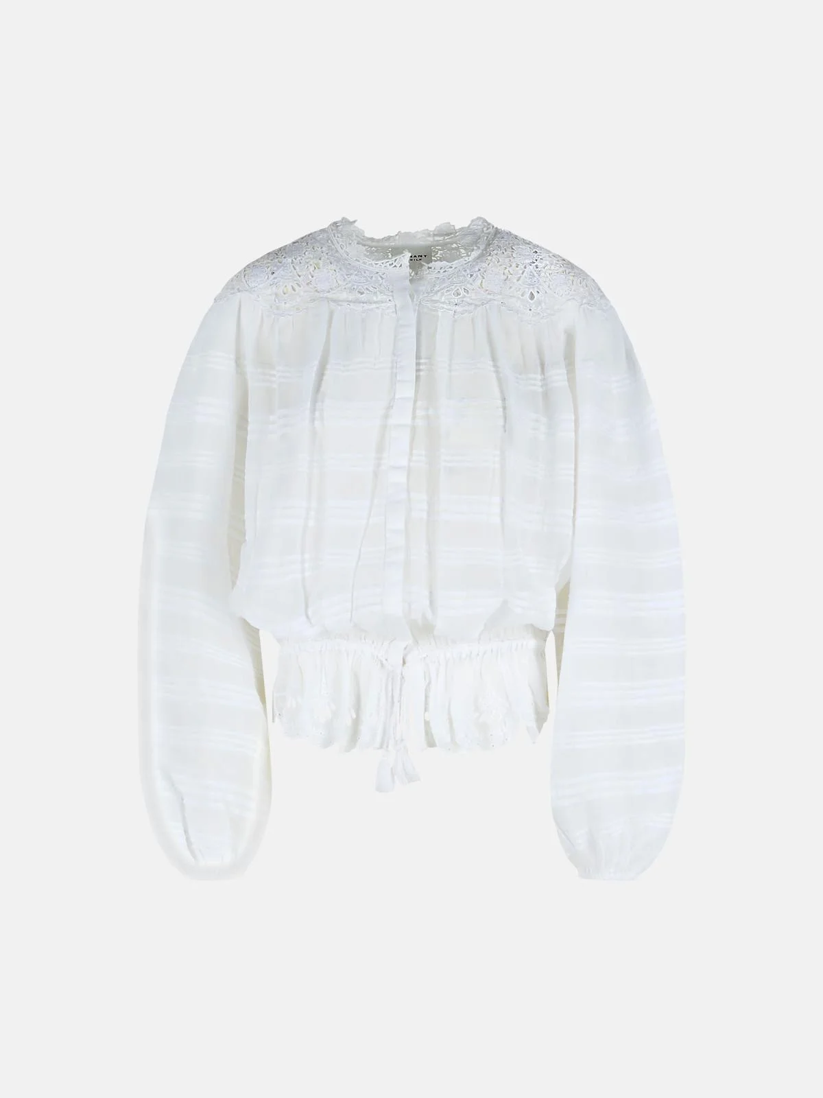 Manufacture code: HT0767FA-D1J05E 20WH Retail code: HT0767FA-D1J05E 20WH Lace top pattern, button closure, structural pleats, wide sleeves, elastic cuffs, elastic drawstring hem, lace trim on the hem Main: 100% cotton Made in India