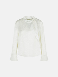 Manufacture code: HT0744FA-C4J07I 20WH Retail code: HT0744FA-C4J07I 20WH Silk blend blouse, high neck with 'lavalliere' bow, long sleeves with buttoned cuffs decorated in lace, asymmetric button closure, fluid cut Main: 70% viscose, 30% silk Made in India