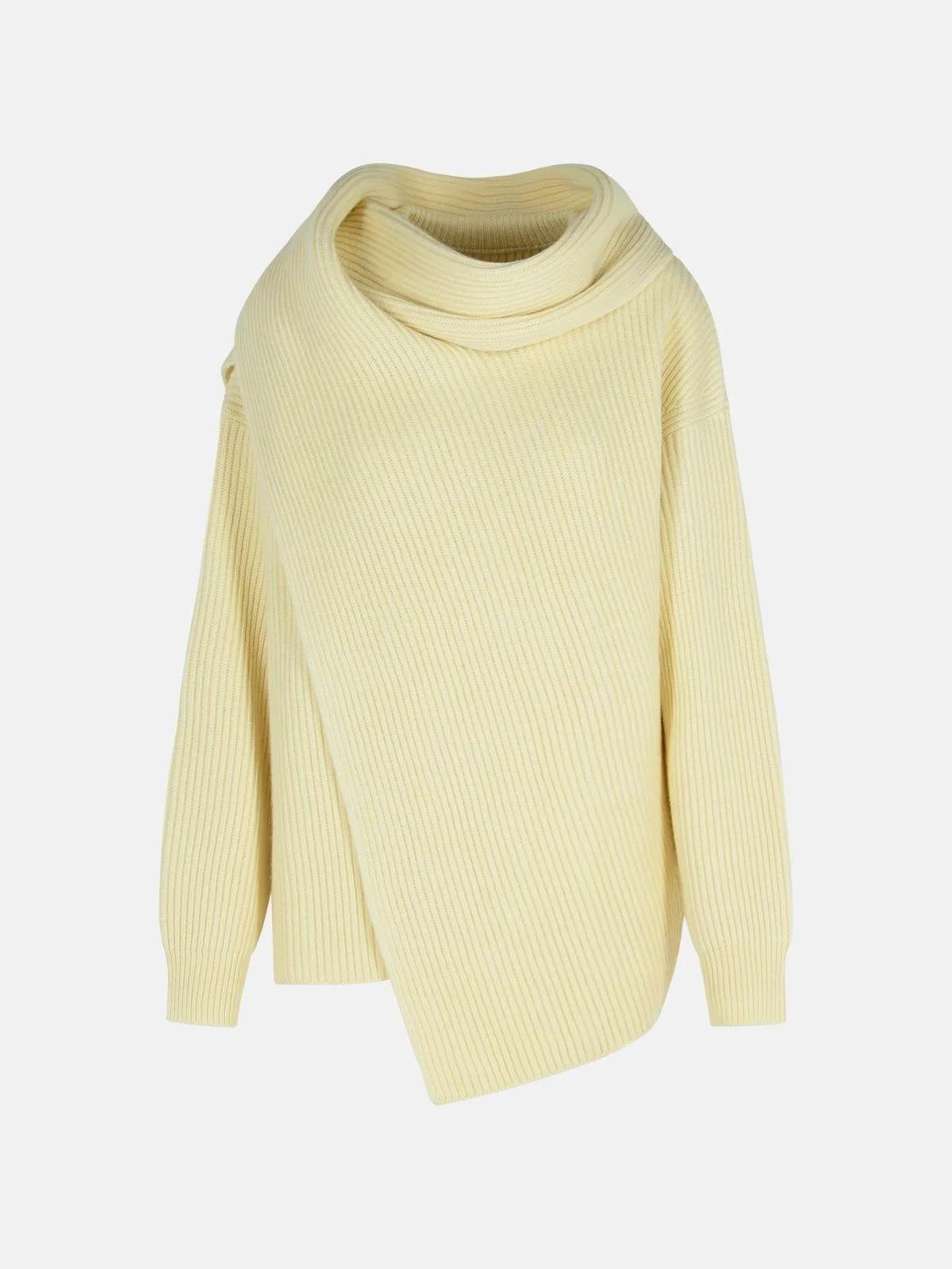 Manufacture code: J02GP0224 J14737 106 Retail code: J02GP0224 J14737 106 Knitted with ribbed pattern, ribbed crew neck, draped scarf at the neck, front opening, single side split hem Main: 70% virgin wool, 30% cashmere Made in Italy