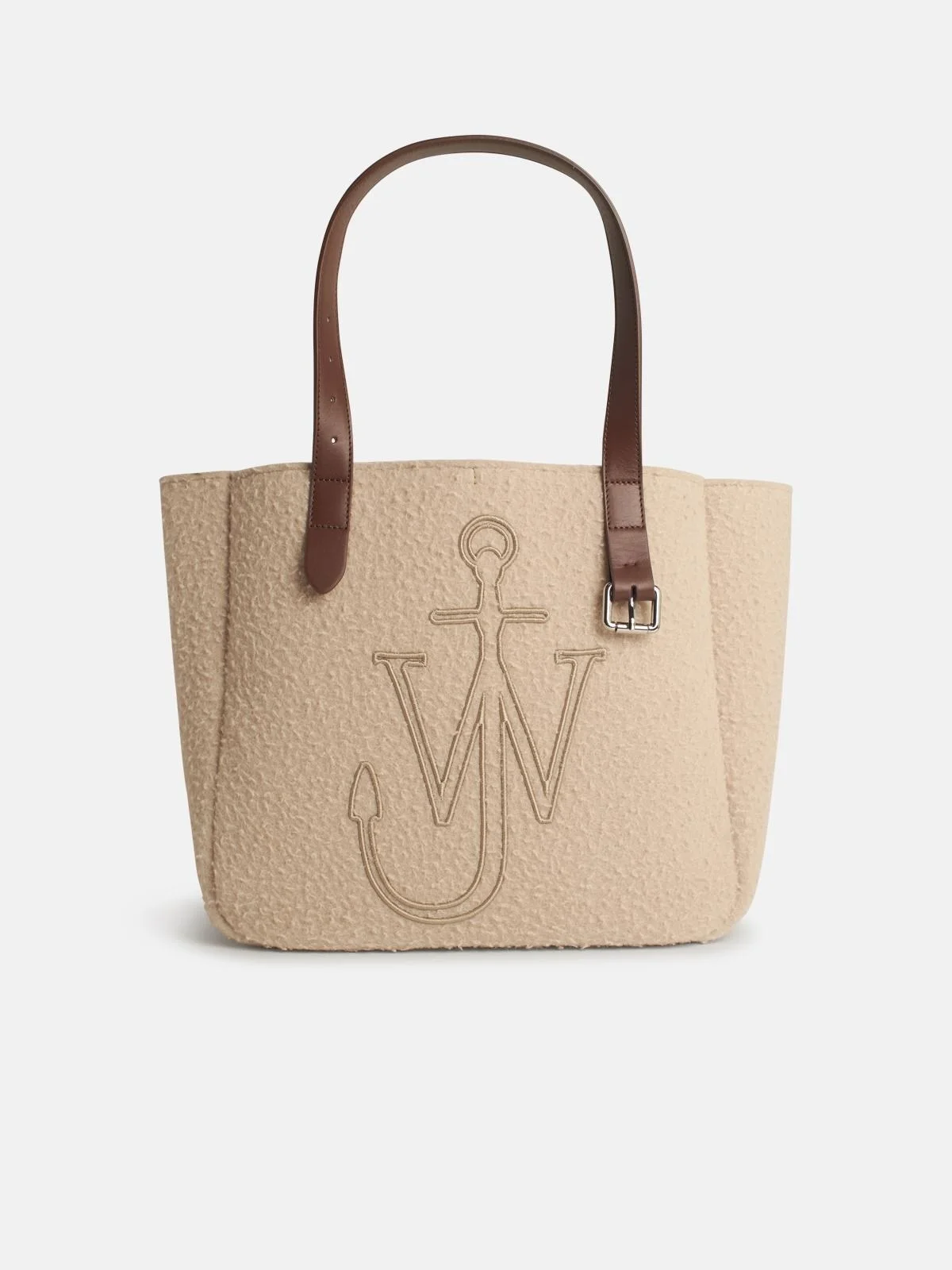 Manufacture code: HB0545 FA0468 132 Retail code: HB0545 FA0468 132 Shoulder bag with leather handle, Anchor JWA logo embroidery on the front, silver metal components, inner leather pocket without lining, top closure with leather laces\n34 x 30.5 x 21.5 cm Main: 90% wool, 10% calf leather Made in Hungary
