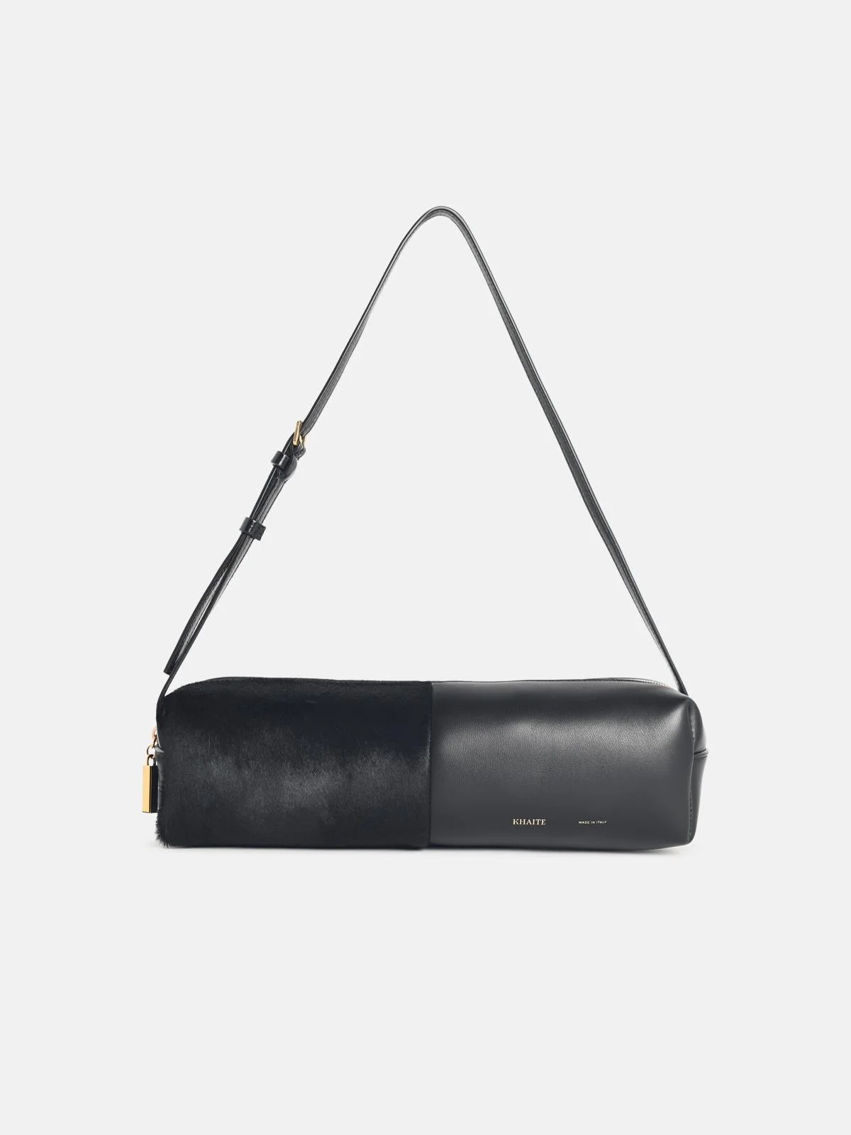 Manufacture code: H2050-1010 L1010 283 Retail code: H2050-1010 L1010 283 An east-west silhouette that aligns and harmonizes a quartet of fine materials, adjustable shoulder strap positioned diagonally for elegant balance, zippered top, lined with soft nappa leather\n30.5 x 8 x 7 cm Main: 100% calf leather Made in Italy