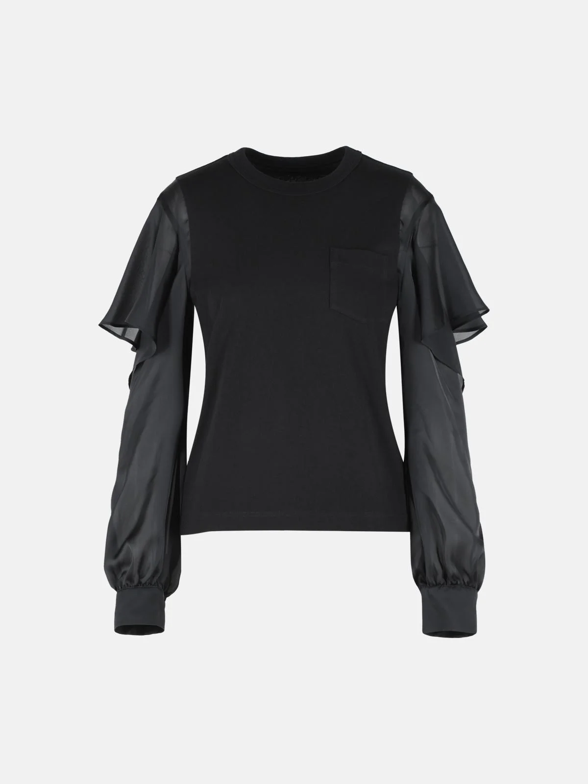 Manufacture code: 26-08403 001 Retail code: 26-08403 001 Ribbed crew neck, chest patch pocket, seethrought polyester sleeves with shrug opening, button cuffs Main: 100% cotton Made in Japan