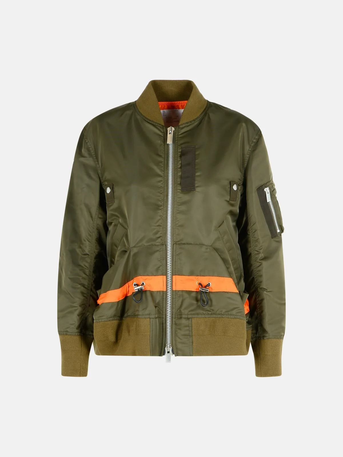 Manufacture code: 25-07992 531 Retail code: 25-07992 531 Ribbed raised collar, zip closure, slanted welt pockets with snap button, envelope pockets, orange contrast drawstring, zip pocket on the sleeve, ribbed hem and cuffs, orange lining Main: 100% nylon Made in Japan