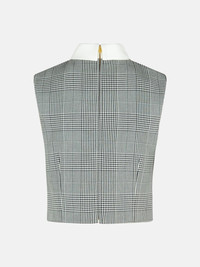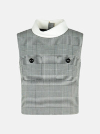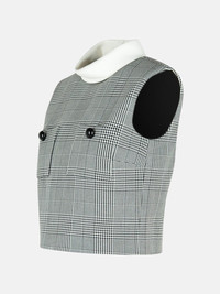 Manufacture code: PF25-036TB-BW BLACK AND WHITE Retail code: PF25-036TB-BW BLACK AND WHITE Contrast raised collar, front patch pockets with decorative button, back hook and zip closure, contrast pattern, straight hem Main: 66% polyester, 31% viscose, 3% elastane Made in China