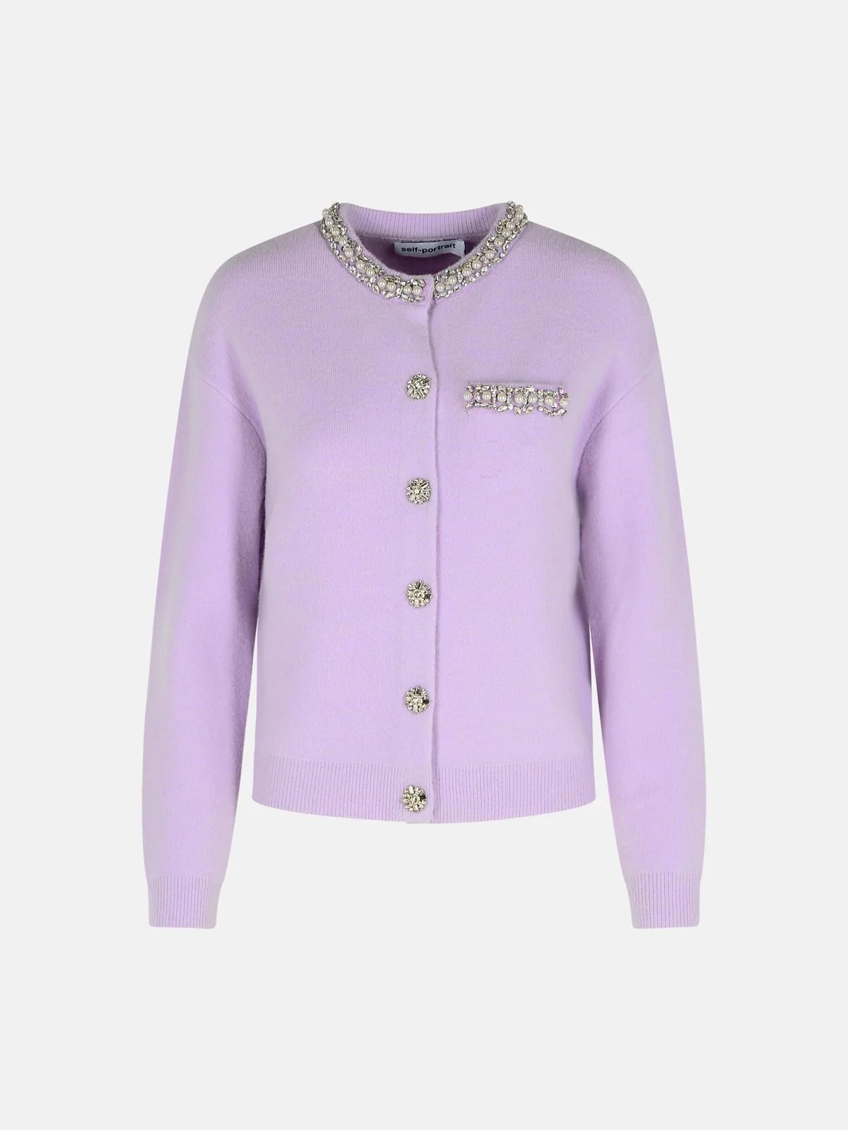 Manufacture code: PF25-085C-L LILAC Retail code: PF25-085C-L LILAC Ribbed crew neck decorated with fake pearls and crystals, front button closure, chest pocket with button and decorated edging, ribbed hem and cuffs Main: 47% viscose, 33% nylon, 13% wool, 5% alpaca, 2% elastane Made in China