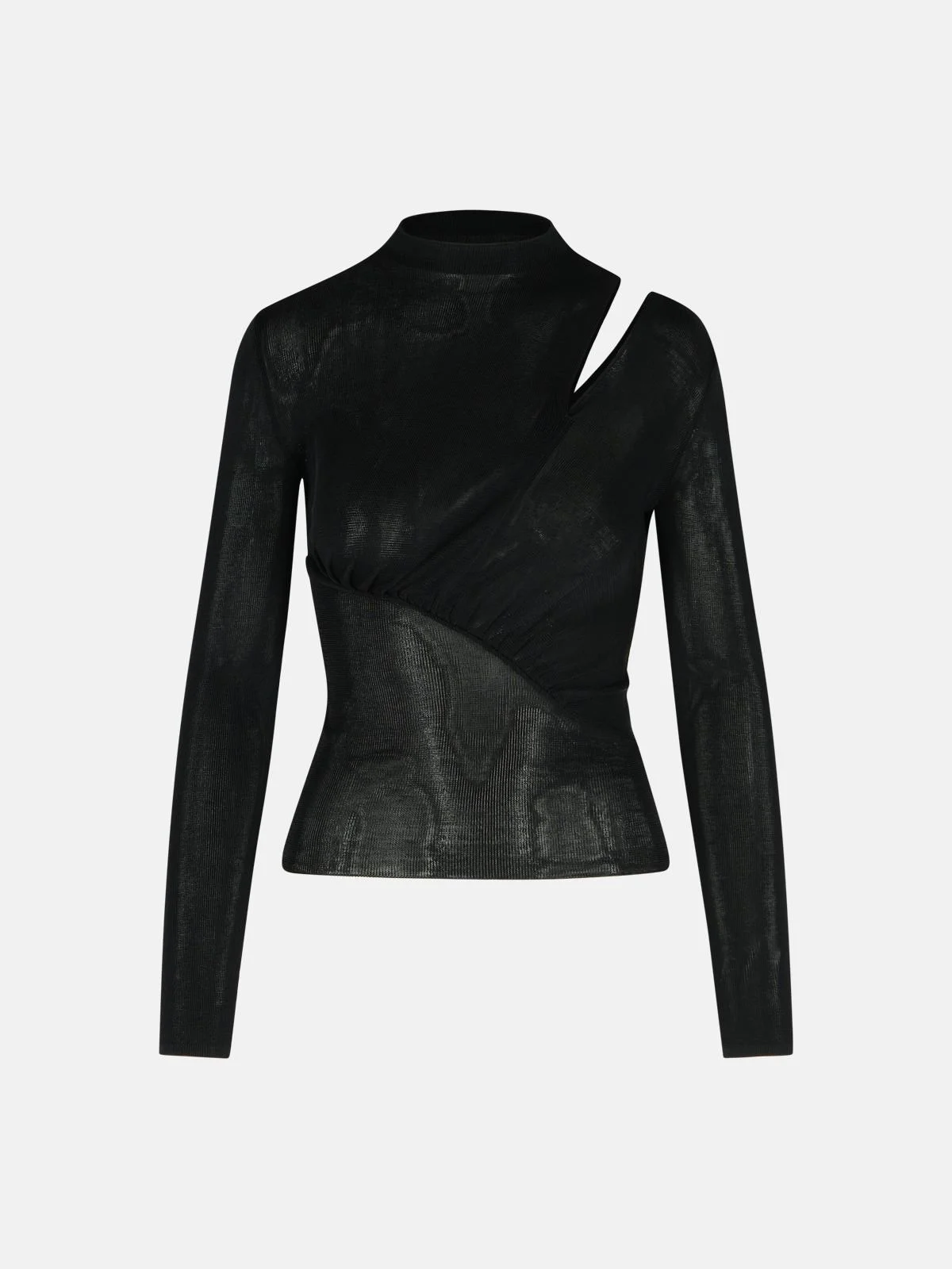 Manufacture code: PF25-086T-B BLACK Retail code: PF25-086T-B BLACK Ribbed crew neck, shoulder opening, decorative draping Main: 100% viscose Made in China