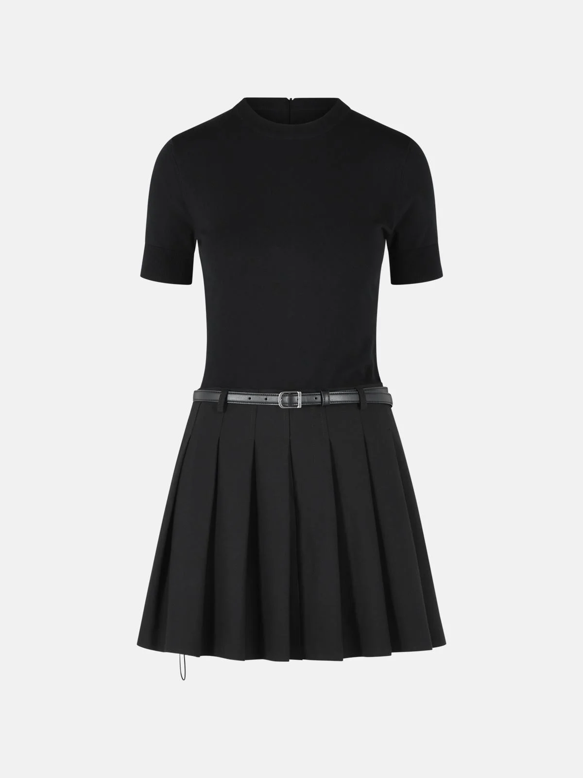 Manufacture code: 126-1255-F BLACK Retail code: 126-1255-F BLACK Ribbed crew neck, back closure with concealed zip, ribbed cuffs, belt loops, buckle belt, pleated skirt Main: 65% polyester, 33% silk, 2% other fibers Made in Vietnam
