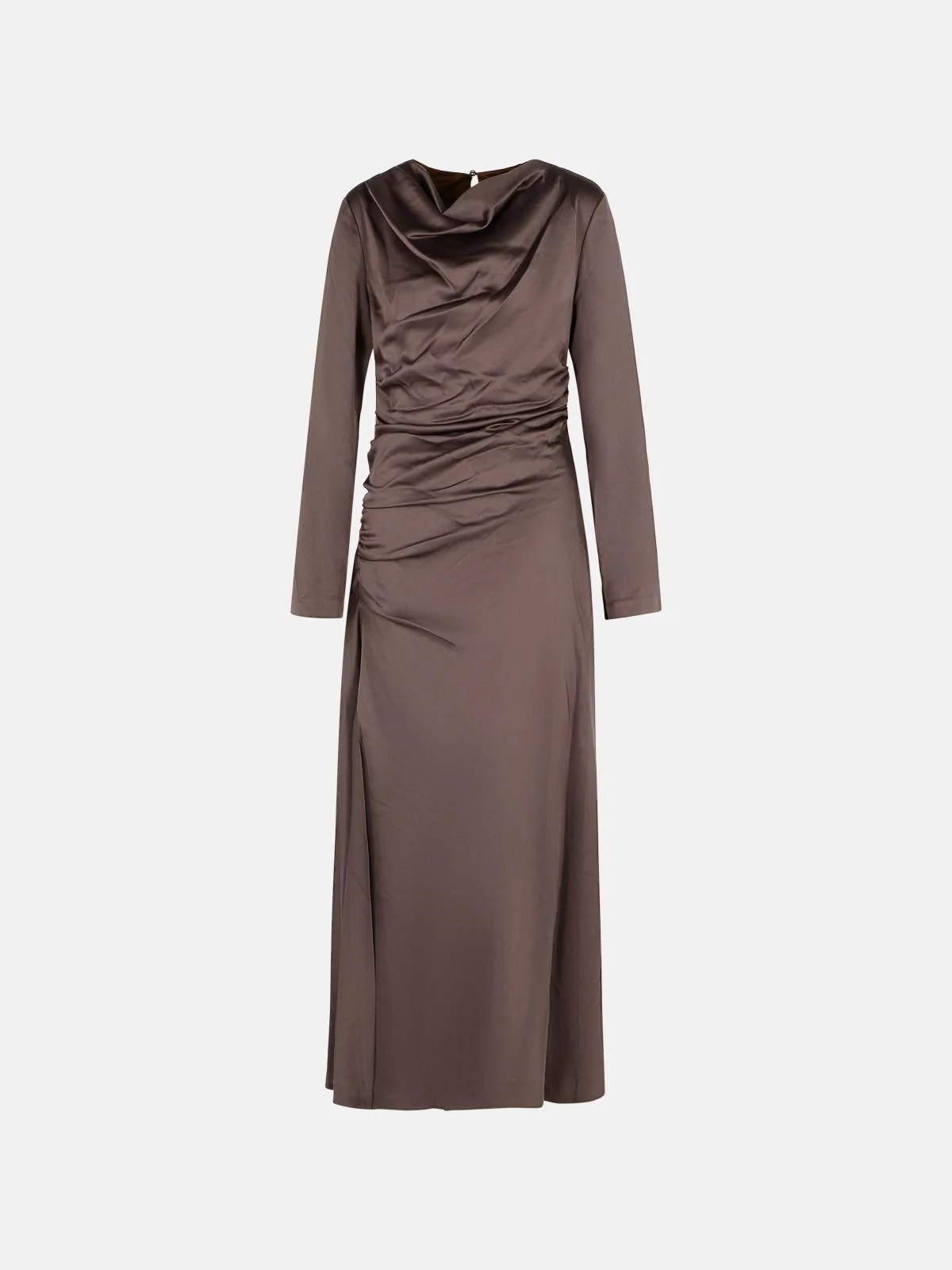 Manufacture code: 525-1219-Q CHOCOLATE Retail code: 525-1219-Q CHOCOLATE Made of polished satin, artfully curled, high neckline, fluid draping, invisible side zip, button on the back of the neck, wrist with split, lined Main: 84% acetate, 16% polyester Made in China