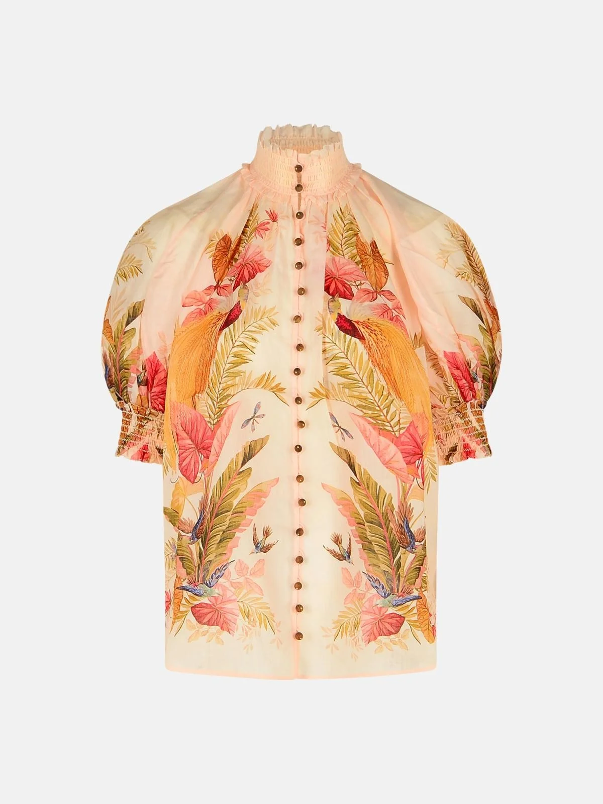 Manufacture code: 4556TSS253 CREAM PALM Retail code: 4556TSS253 CREAM PALM Floral print all over the garment, high neckline with curl, puff sleeves with elasticated cuffs, drawstring buttonholes embellished with wooden beads Main: 100% other fibers Made in China