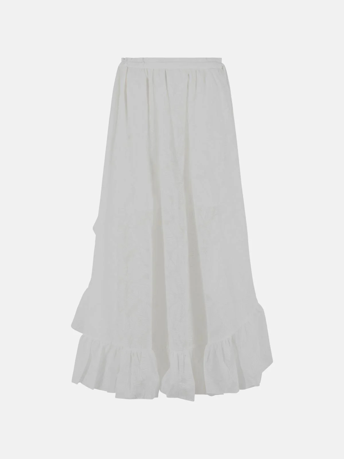 Manufacture code: 5770SRS263 IVORY Retail code: 5770SRS263 IVORY Drawstring waistband, tone leaf pattern, ruffle on the hem with side split Main: 58% cotton, 42% polyester Made in China