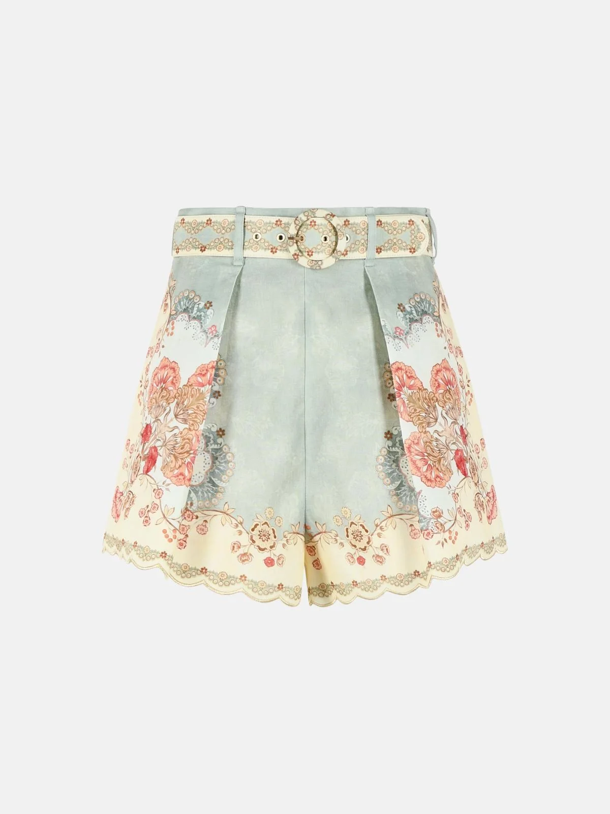 Manufacture code: 4558ARS263 WALLPAPER FLORAL MINT Retail code: 4558ARS263 WALLPAPER FLORAL MINT Belt loops, buckle belt, invisible back zip closure, side slit pockets, multicolored floral pattern, gold edging hem, cotton lining Main: 100% flax Made in China