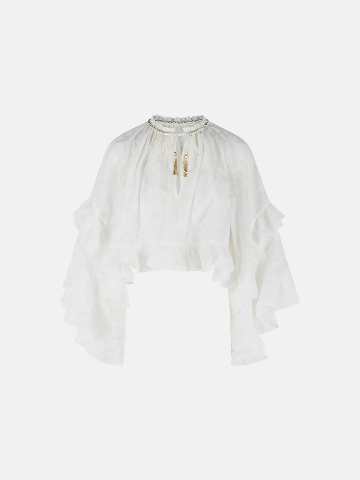 Manufacture code: 6883TRS263 IVORY Retail code: 6883TRS263 IVORY Tone leaf pattern, tie neck closure, ruffled sleeves and hem, matching cotton bra with back interlocking closure Main: 58% cotton, 42% polyester Made in China