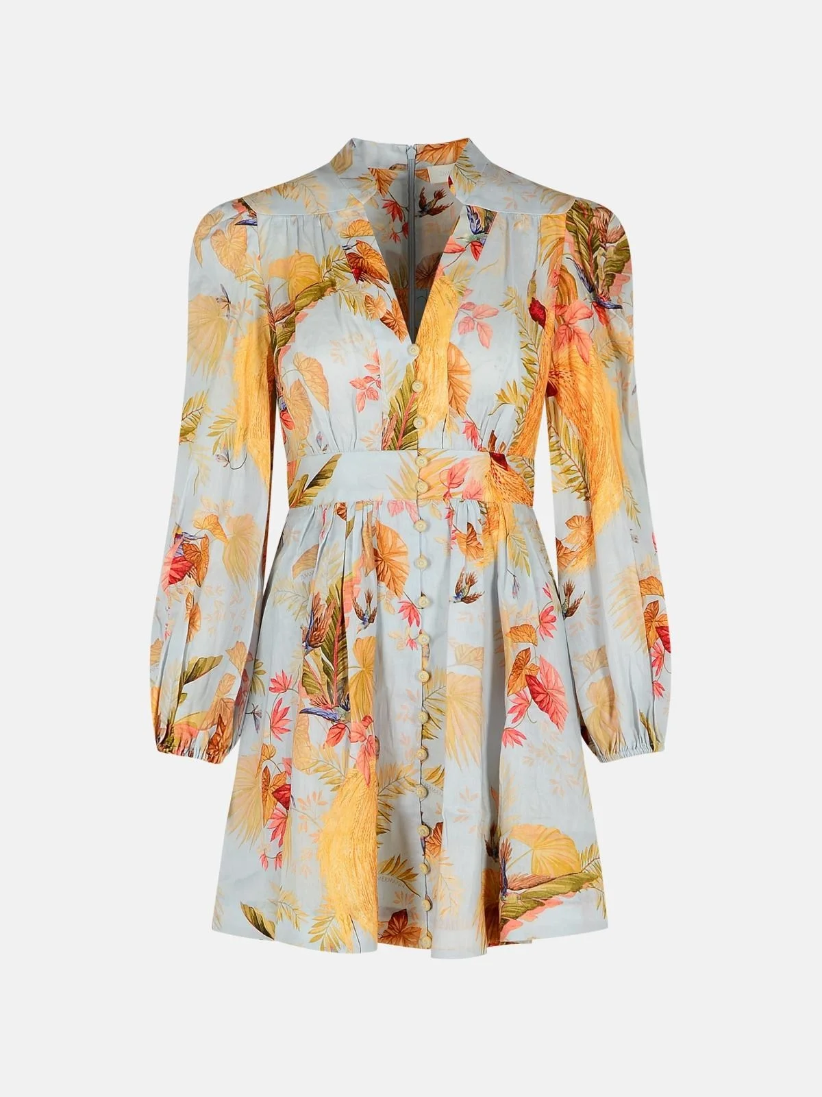 Manufacture code: 5147DSS253 LIGHT BLUE PALM Retail code: 5147DSS253 LIGHT BLUE PALM Leaf pattern print all over the garment, puff sleeves with elasticated cuffs, front button closure, invisible zip closure in the center at the back, lined skirt Main: 100% flax Made in China