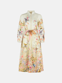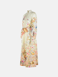 Manufacture code: 9143DC261 CREAM AVIARY Retail code: 9143DC261 CREAM AVIARY Slightly raised neck, decorated front buttons, floral bird motif, belted waist loops, side welt pockets, invisible back zip, elastic cuffs, long skirt Main: 100% flax Made in China