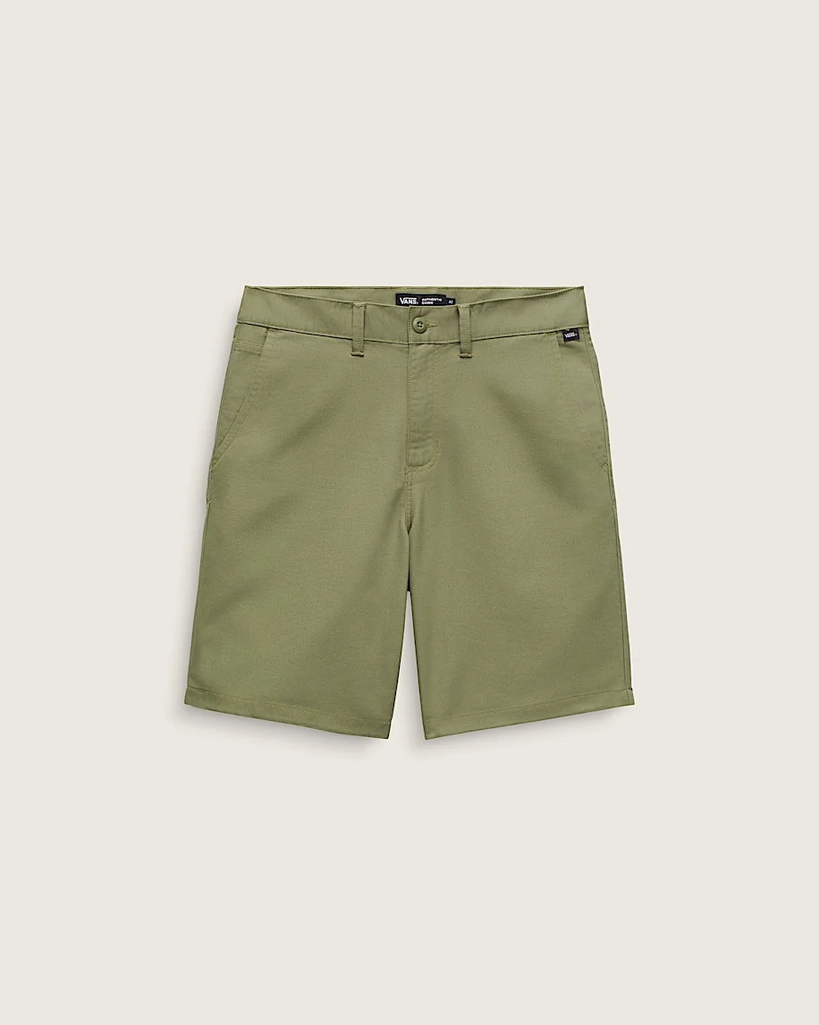 Style VN0A5FJXZBF The Authentic Chino Relaxed 20'' Shorts are made for everyday wear with soft fabrication and a relaxed fit that moves with you through all you do. There's plenty of pockets to stash essentials, and an embroidered Drop V bartacks for added branding. The “V” belt loop detail on the back waistband and checkerboard twill taping finish the look with iconic Vans® signatures. Details - Classic chino styling with soft fabrication - Front hand pockets with coin pocket at the right - Embroidered Drop V bartack below front pocket - Rear welt pockets with button closure - “V” back belt loop detail - Checkerboard twill taping on the internal fly facing - Relaxed fit for easy movement and a laid-back feel - Outseam: 20" - 64% cotton, 34% polyester, and 2% spandex fabric