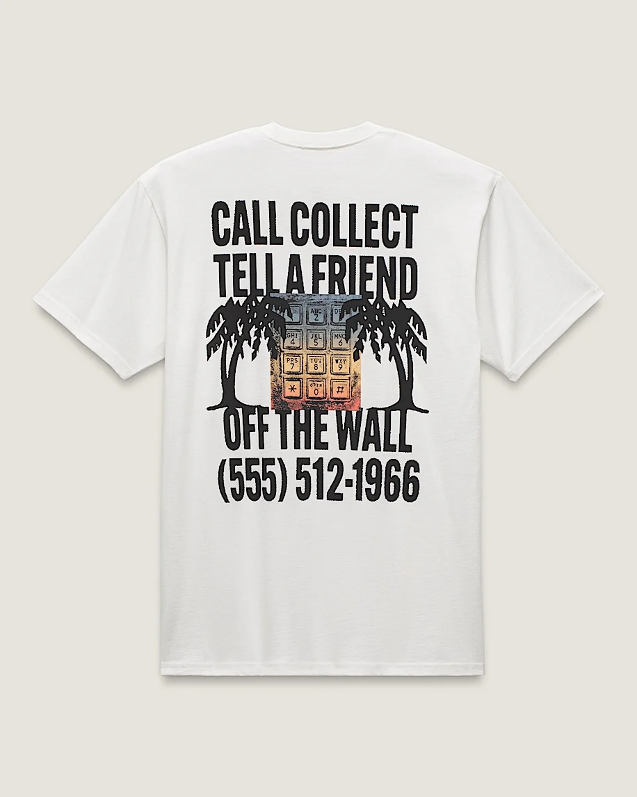 Style VN000M6TFS8 Spread the word in the Call Collect T-Shirt, a classic fit short sleeve crew neck T-shirt with screenprinted graphics of a Vans® call to action on the front, and a larger graphic of an old school dial pad on the back. Details - Short-sleeve crew neck t-shirt - Screen print artwork for a long-lasting design - Classic fit for a natural and easy feel - 100% cotton