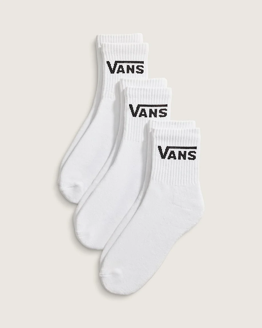 Style VN000QBWWHT The Classic Half Crew Socks 3-Pack offers a lower profile with the same go-to comfort. Finished with cushioned soles and jacquard logos, these socks stay put and feel right no matter where the day takes you. Details - Half crew height for a lower profile fit - Cushioned sole adds softness underfoot - Ribbed cuff for a secure, stay-up feel - Jacquard Vans logo at the side - Sold as a 3-pack - 71% cotton, 23% polyester, 2% nylon, 2% elastodiene, 2% elastane - Small: US Mens 3.5 - 6 / US Womens 5 - 7.5 - Medium: US Mens 6.9 - 9 / US Women’s 8 - 10.5 - Large: US Mens 9.5 - 13 / US Womens 11 - 14.5 - X-Large: US Mens 14 - 17 / US Womens 15.5 - 18.5