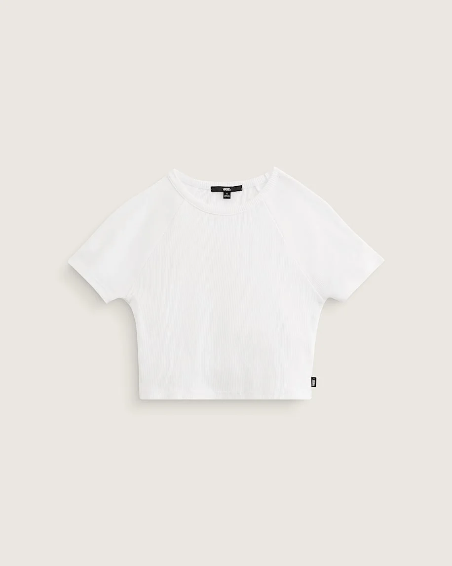 Style VN000M97WHT Channel the 90s in the Drew Baby Tee, a goes-with-anything knit rib fitted t-shirt that's longer than a crop, but shorter than a classic cut. A Vans® flag label at the hem finishes the shirt in streetwear style. Details - Rib knit baby tee - Flag label at the hem - 100% cotton