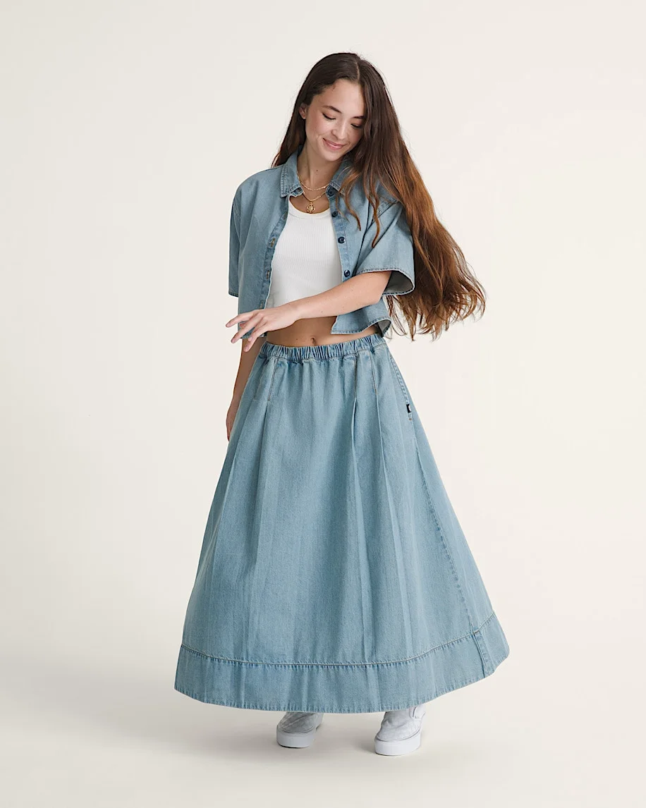 Style VN0010A1CDX The Francesca Full Skirt brings a free-flowing shape to classic denim. Stone-washed for softness and cut with plenty of movement, it delivers a relaxed fit that feels effortless from the jump. Easy to style up or down, it’s a go-anywhere piece built for days that don’t follow a script. Details - Full silhouette adds easy movement and all-day comfort - Elastic waistband offers pull-on simplicity - Stone wash delivers a soft, lived-in feel - Relaxed fit keeps movement easy and natural - 100% cotton