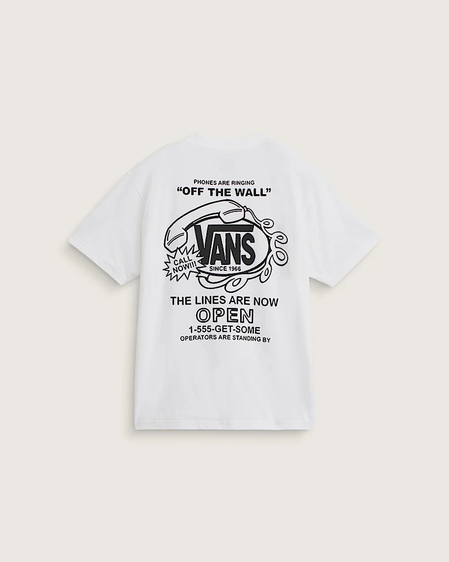 Style VN000SYBWHT This T-shirt brings Vans' quirky spirit to life with a playful rotary phone graphic and cheeky messaging. The soft cotton construction and classic fit make it an easy everyday choice, while the eye-catching back print adds an extra dose of attitude. It's a fun way to show off your Vans pride with a wink and a nod to the brand's long-running heritage. Details - Screen print artwork for a long-lasting design - Crewneck shirt for a classic look - Short sleeves for a casual, everyday style - Classic fit for a natural and easy feel - 100% cotton