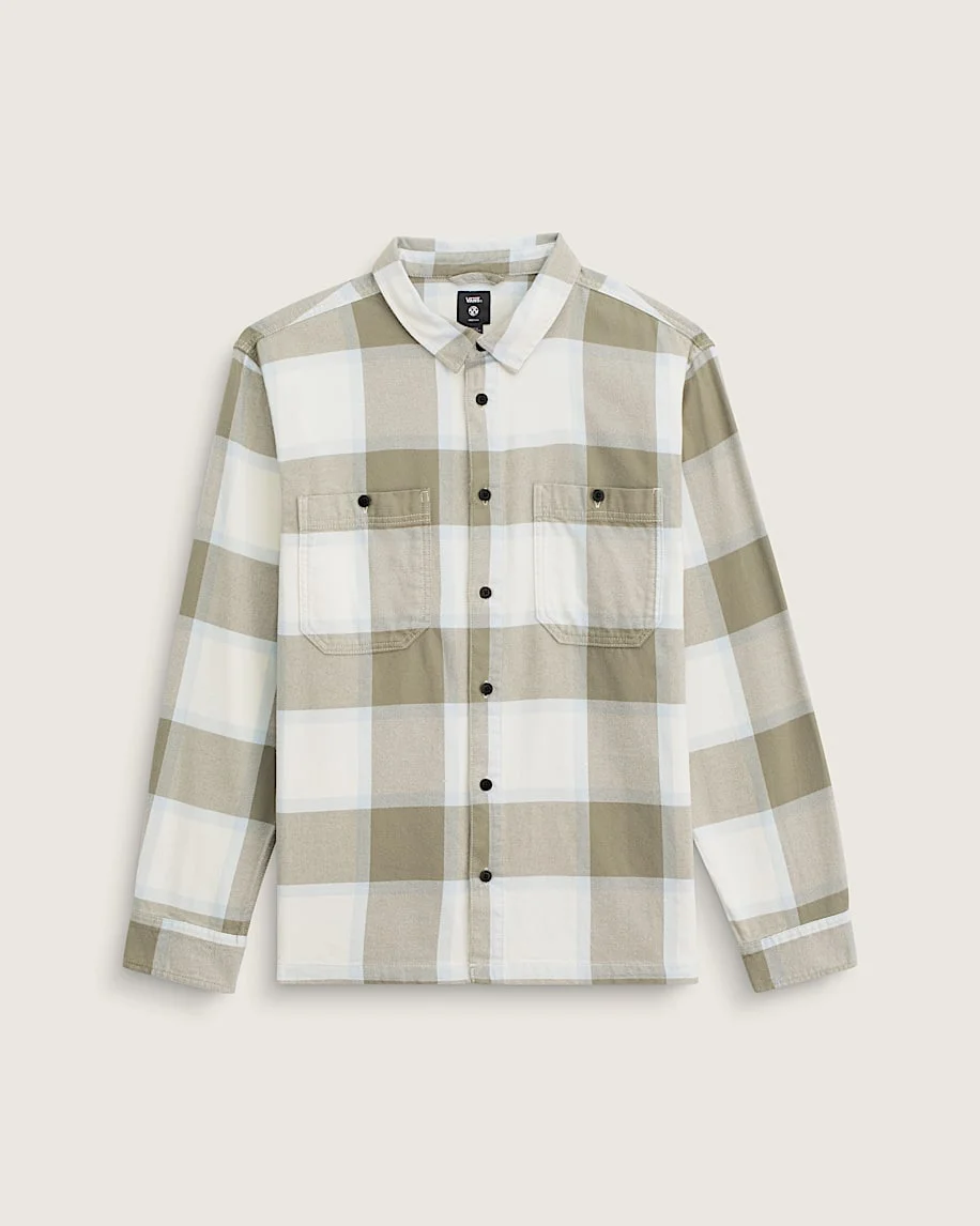 Style VN000P7ZDJR Made with dense three-ply organic cotton yarn, the Larkspur Flannel Shirt takes a classic button-down collared shirt and makes it a cold weather must. As soft and comfortable as it is durable, it features branded Vans details like a chest patch pocket and woven label at the hem. Details - Long sleeve button down shirt - 3-ply 200g yarn - Chest patch pocket - Straight hem with woven label for additional branding - 100% organic cotton