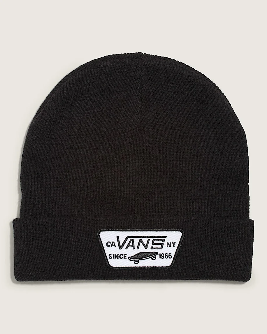 Style VN000UOUBLK This ribbed knit beanie brings Vans heritage to your everyday look. The cuffed design and stretchy construction provide a secure, comfortable fit that moves with you. A rectangular patch showcases Vans' iconic logo and ''SINCE 1966'' text, celebrating the brand's deep roots in skate culture. Whether you're hitting the streets or just keeping cozy, this beanie delivers timeless style with a modern edge. Details - Ribbed knit construction for a close, comfortable fit - Cuffed design for adjustable warmth and style - Rectangular patch adds iconic Vans branding - Stretchy material moves with you for all-day comfort - Classic skate-inspired look that goes with everything