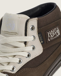 Style VN000DADEMP Originally released in 1988, the Half Cab set the standard for skate performance. This elevated version respects that legacy while pushing things forward with GORE-TEX weatherproofing made to withstand tough conditions, while a Sola Foam ADC insole and upgraded footbed bring soft, everyday comfort. Details - Signature mid top shoe - Leather and canvas upper with GORE-TEX® waterproof - Lace-up closure for an adjustable fit - Padded collar for support and comfort - Higher sidewall with gloss finish - Foxing tape inspired by original 90's Osnaburg reinforced outsoles - Upgraded footbed and refined construction combine for a more seamless fit - Sola Foam ADC (All-Day Comfort) insole for soft and durable cushioning, it is made using at least 30% biobased PU foam partially derived from plants and it is USDA Certified Biobased - Signature waffle outsole pattern for reliable grip since '66