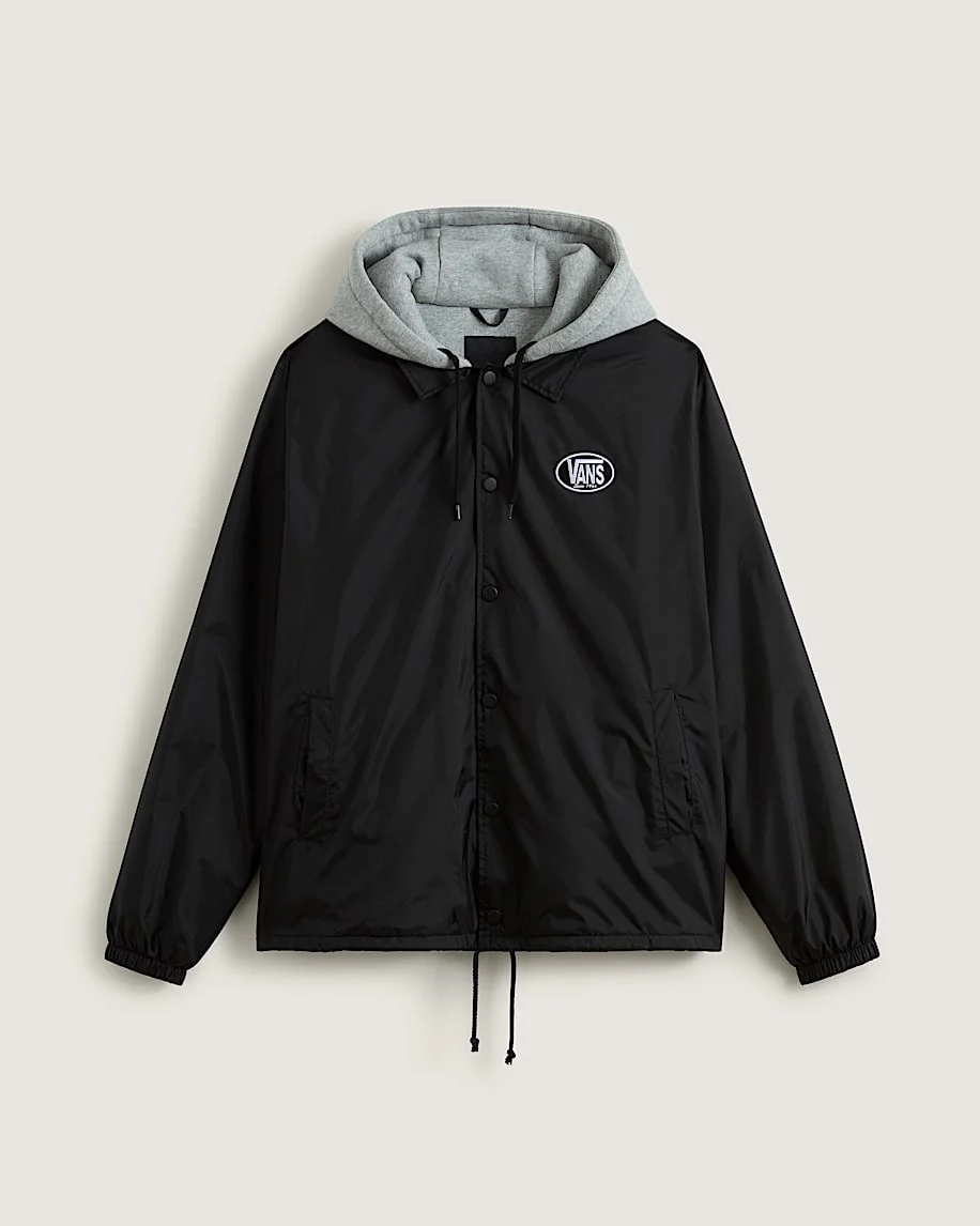 Style VN000P75BLK The Riley Hooded Coach's Jacket updates a timeless silhouette with a fleece-lined hood and body for extra warmth. Made from water-resistant nylon, this lightweight layer is built to block wind and weather without the bulk. Details - Water-resistant nylon jacket - Fleece-lined hood and body - Vans logo patch at left chest - Elastic cuffs - Drawstring at bottom hem - 100% nylon shell