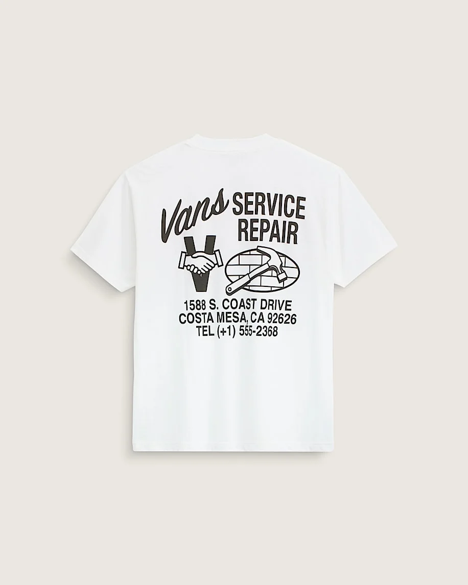 Style VN000PBEWHT Fix your fashion with the Service Repair T-Shirt, featuring short sleeves for a casual, everyday style. Screen print artwork for a long-lasting design points to a fictional repair shop at the address for Vans HQ. Details - Classic crewneck for easy wear - Short sleeves for a casual look - Screen-printed artwork at front - 100% cotton